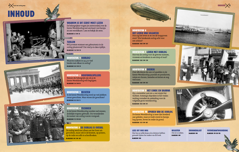 Met geweldige tekeningen en foto's is dit een geweldig naslagwerk voor kinderen. Veel kinderen zijn geïnteresseerd in de Wereldoorlogen, omdat het meer tot de verbeelding spreekt dan de oorlogen die er waren in de 17e eeuw. Natuurlijk zijn er veel lugubere dingen gebeurd in de Eerste Wereldoorlog. De keuzes van de schrijvers zijn er om die wel te benoemen, maar om niet in details te treden. Dat vinden wij een hele wijze keuze, omdat daardoor de oorlog wel bespreekbaar wordt en toegankelijk wordt voor kinderen. De nare details leren ze later wel als ze wat ouder zijn en daar aan toe zijn.