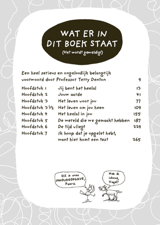 Het boek is verdeeld in 7 hoofdstukken (Nou eigenlijk acht, want hoofdstuk 3 1/2 telt natuurlijk als gewoon een hoofdstuk). Het zijn zeer interessante hoofdstukken, omdat het allemaal betrekking heeft op jou als lezer (zie het plaatje hieronder). Dat maakt het persoonlijker dan de meeste encyclopedieën of gidsen over alles. Maar in dit boek schuwt Denton niet om kennis over te dragen. Natuurlijk zitten in die kennisoverdracht grappige en zeker voor ouderen flauwe plaatjes, maar het maakt al die informatie wel luchtig. Dat maakt deze gids voor alles zó interessant.